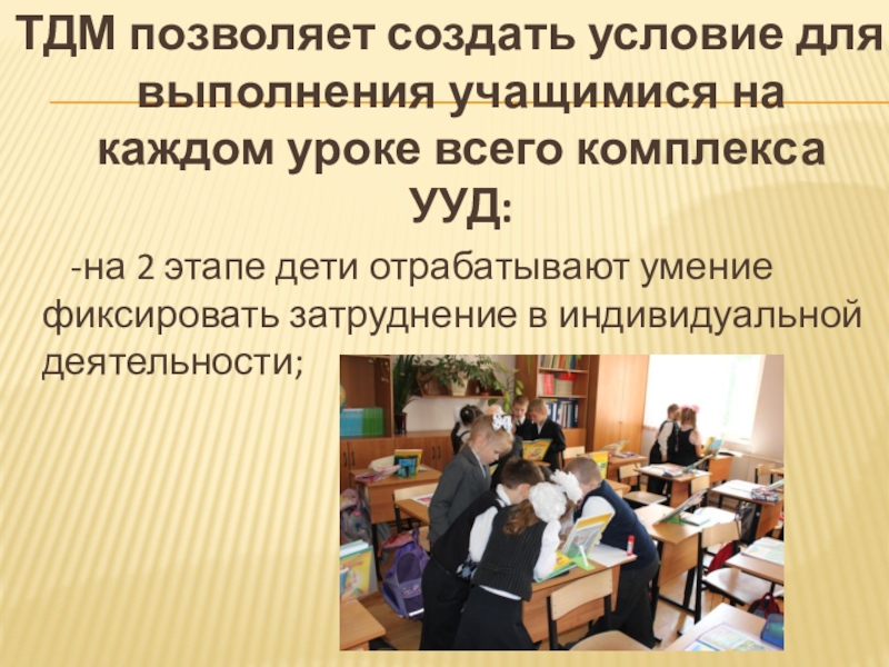 Слайд 11ТДМ позволяет создать условие для выполнения учащимися на каждом уроке всего
