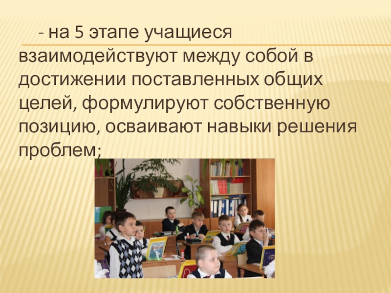 Слайд 13 - на 5 этапе учащиеся взаимодействуют между