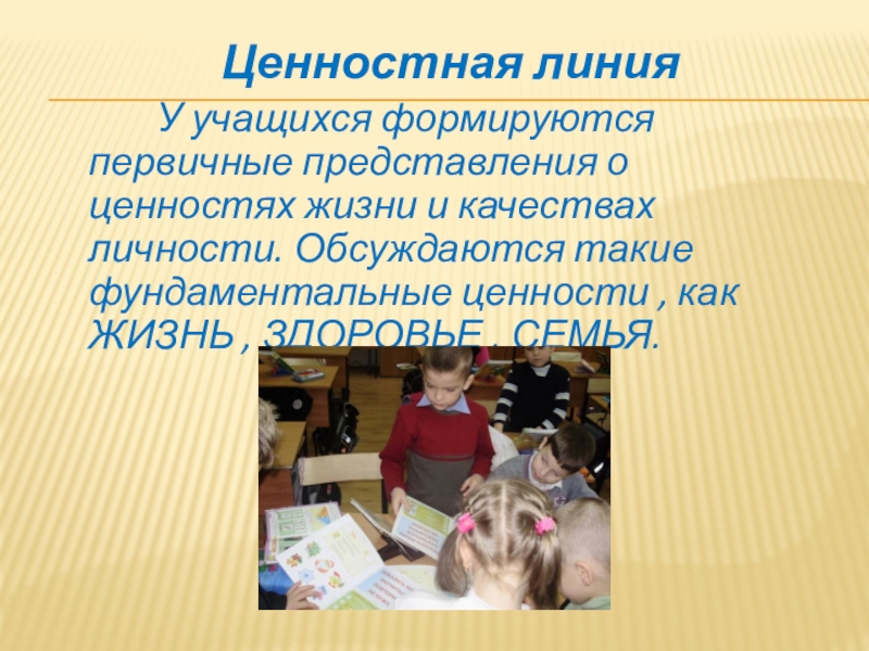 формируются первичные представления о ценностях жизни и качествах личности. Обсуждаются такие фундаментальные ценности , как ЖИЗНЬ , ЗДОРОВЬЕ , СЕМЬЯ.