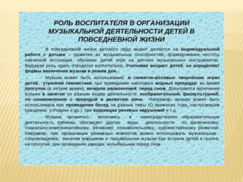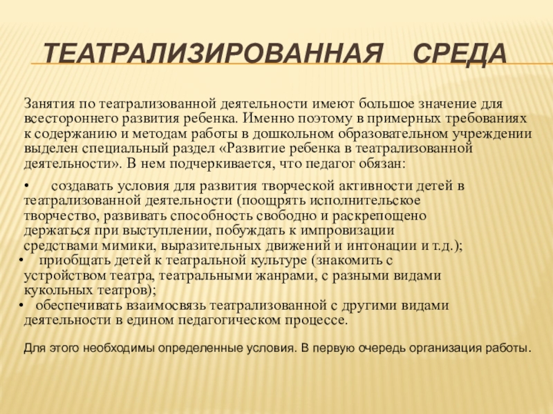 значение для всестороннего развития ребенка. Именно поэтому в примерных требованиях к содержанию и методам работы в дошкольном образовательном учреждении выделен специальный раздел «Развитие ребенка в театрализованной деятельности». В нем подчеркивается, что педагог обязан: