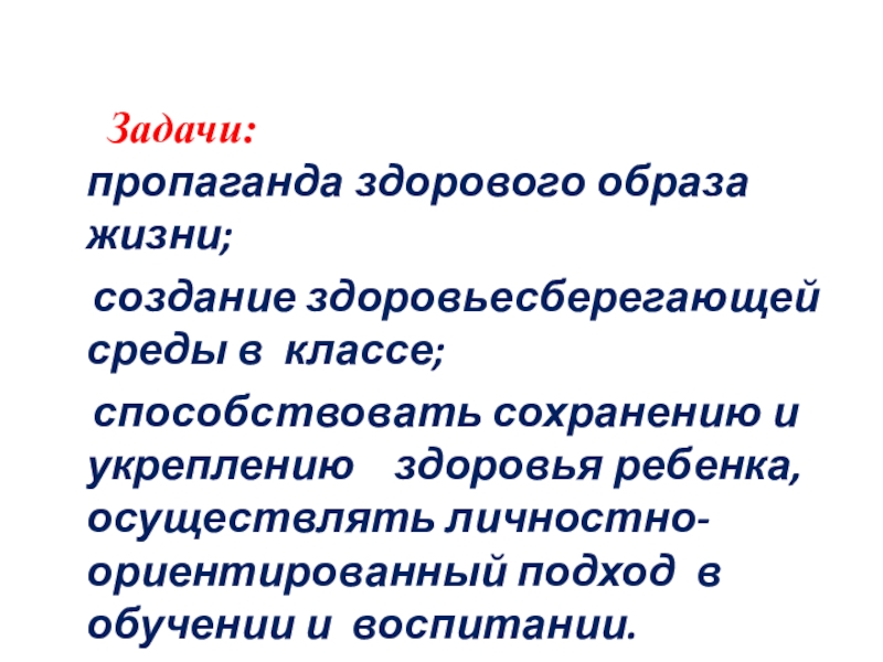способствовать сохранению и укреплению здоровья ребенка, осуществлять личностно- ориентированный подход в обучении и воспитании.
