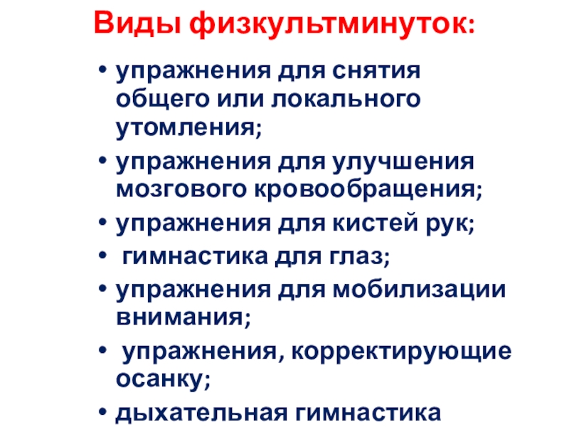 Виды физкультминуток:  упражнения для снятия общего или локального утомления;упражнения для улучшения мозгового кровообращения;упражнения для кистей рук;