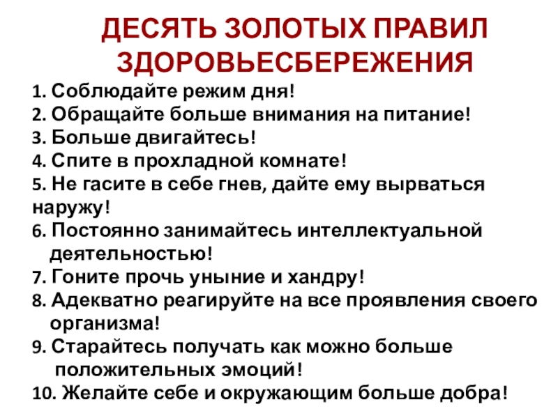 ДЕСЯТЬ ЗОЛОТЫХ ПРАВИЛ ЗДОРОВЬЕСБЕРЕЖЕНИЯ1. Соблюдайте режим дня!2. Обращайте больше внимания на питание!3. Больше двигайтесь!4. Спите в прохладной