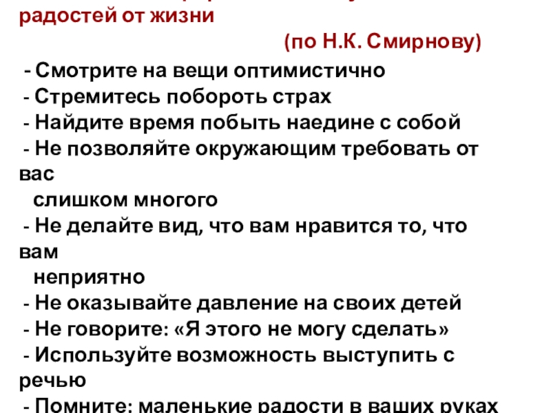 жизни (по Н.К. Смирнову) - Смотрите на вещи оптимистично - Стремитесь побороть страх - Найдите время побыть наедине с собой - Не позволяйте окружающим требовать от вас слишком многого - Не делайте вид, что вам нравится то, что вам неприятно - Не оказывайте давление на своих детей - Не говорите: «Я этого не могу сделать» - Используйте возможность выступить с речью - Помните: маленькие радости в ваших руках - Не забывайте, что вы красивы