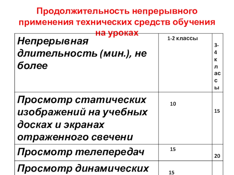 Слайд 12Продолжительность непрерывного применения технических средств обучения на уроках