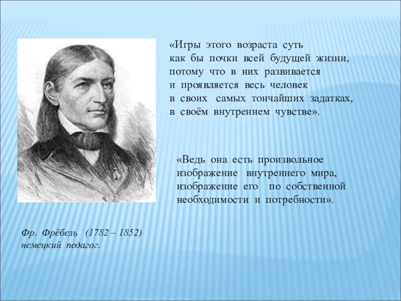 «Дитя, которое играет самодеятельно, спокойно, настойчиво, даже до телесного утомления, непременно сделается таким же способным, спокойным, настойчивым, самоотверженно радеющим о чужом и собственном благе».