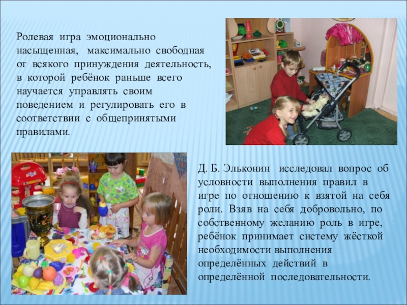 Д. Б. Эльконин исследовал вопрос об условности выполнения правил в игре по отношению к взятой на себя роли. Взяв на себя добровольно, по собственному желанию роль в игре, ребёнок принимает систему жёсткой необходимости выполнения определённых действий в определённой последовательности.