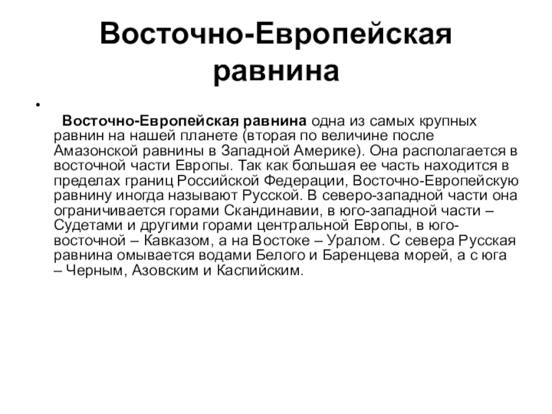 планете (вторая по величине после Амазонской равнины в Западной Америке). Она располагается в восточной части Европы. Так как большая ее часть находится в пределах границ Российской Федерации, Восточно-Европейскую равнину иногда называют Русской. В северо-западной части она ограничивается горами Скандинавии, в юго-западной части – Судетами и другими горами центральной Европы, в юго-восточной – Кавказом, а на Востоке – Уралом. С севера Русская равнина омывается водами Белого и Баренцева морей, а с юга – Черным, Азовским и Каспийским.