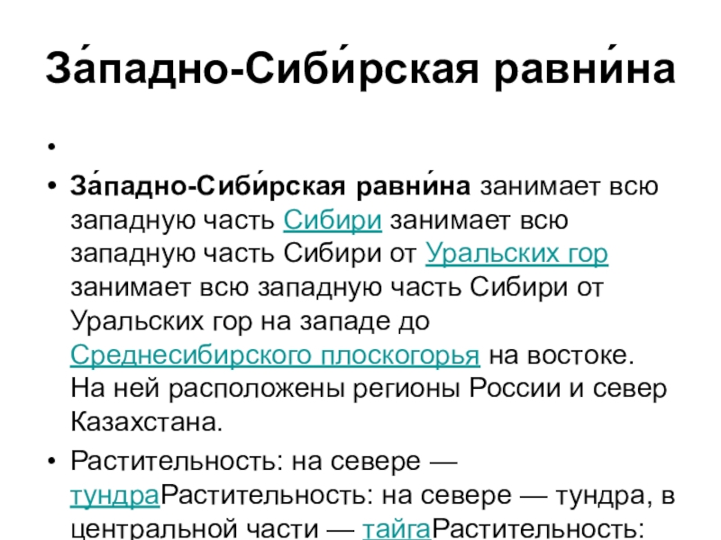 За́падно-Сиби́рская равни́на занимает всю западную часть Сибири занимает всю