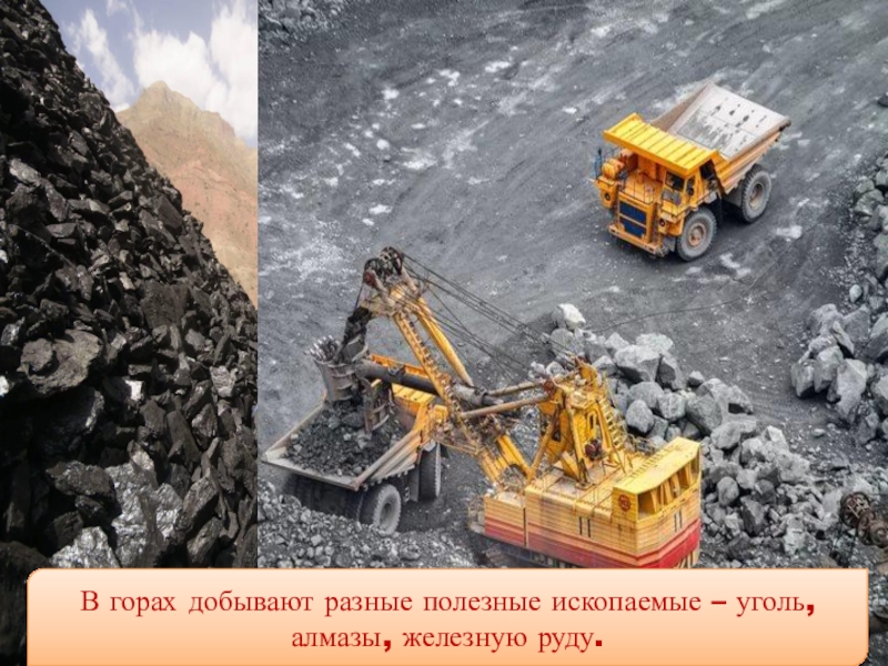 Слайд 10В горах добывают разные полезные ископаемые – уголь, алмазы, железную руду.