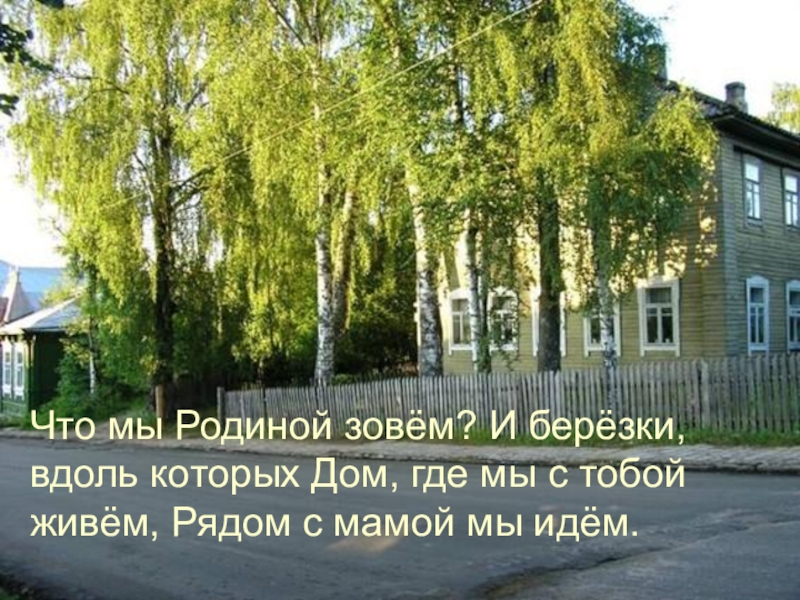 Что мы Родиной зовём? И берёзки, вдоль которых Дом, где мы с тобой живём, Рядом с мамой мы идём.