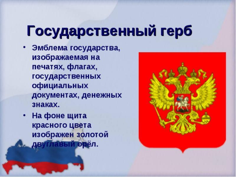 У России величавой На гербе орёл двуглавый, Чтоб на запад на восток Он смотреть бы сразу мог. Сильный, мудрый он и гордый. Он – России дух свободный.