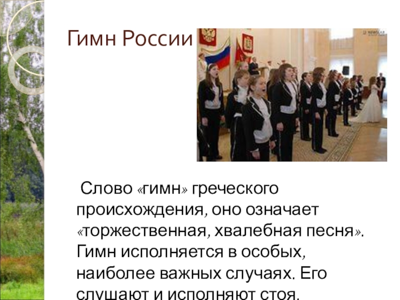 Слово «гимн» греческого происхождения, оно означает «торжественная, хвалебная песня». Гимн