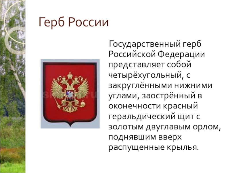 Государственный герб Российской Федерации представляет собой четырёхугольный, с