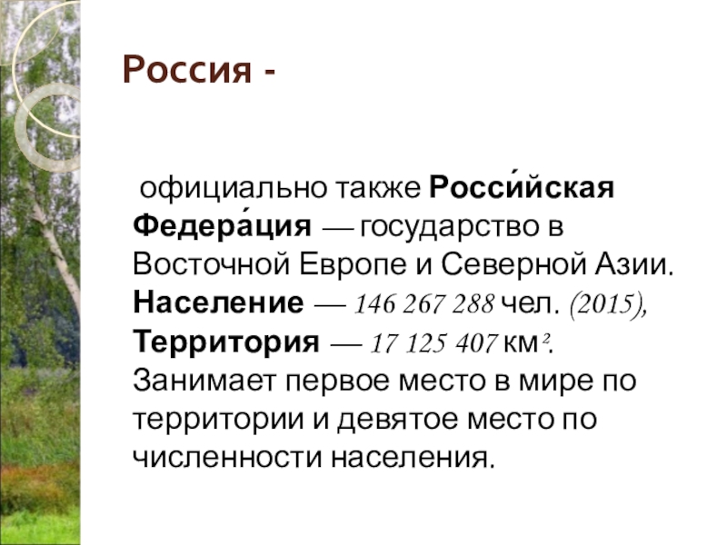 и Северной Азии. Население — 146 267 288 чел. (2015), Территория — 17 125 407 км². Занимает первое место в мире по территории и девятое место по численности населения.