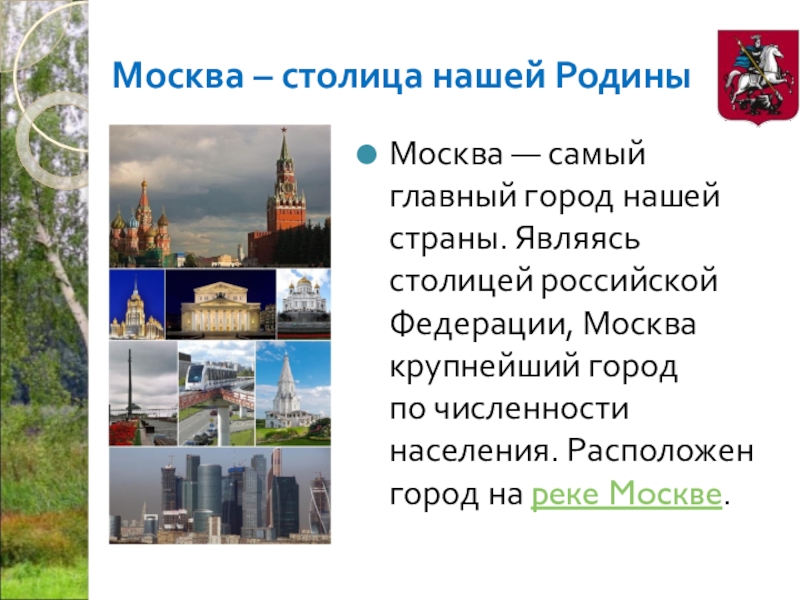 столицей российской Федерации, Москва крупнейший город по численности населения. Расположен город на реке Москве.