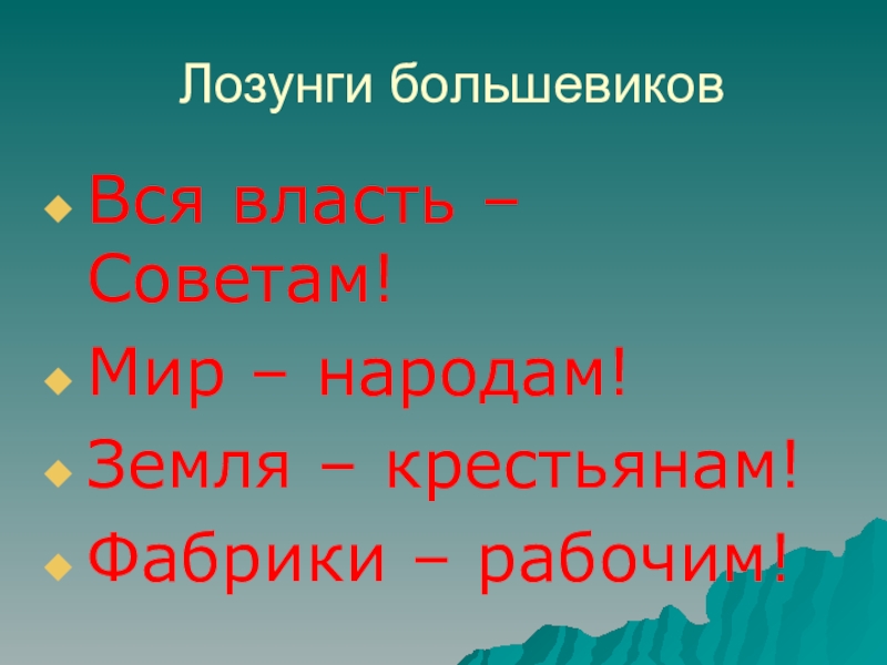 Лозунги большевиковВся власть – Советам!Мир – народам!Земля – крестьянам!Фабрики – рабочим!