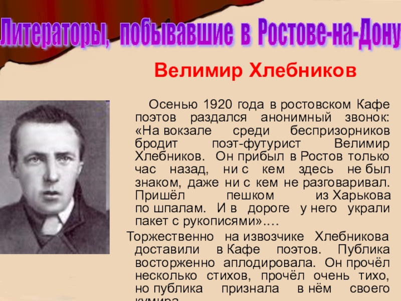 посетил Ростов. В Театральной мастерской он появился внезапно, во время репетиции. Вошёл в зал со словами: «Я Гумилёв». Юные артисты онемели. А Гумилёв просил показать отрывки из его пьесы. Не скрывая волнения, артисты стали исполнять роли. Поэт пришёл в восторг.