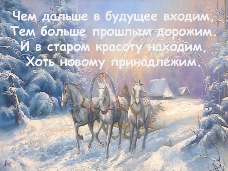Чем дальше в будущее входим, Тем больше прошлым дорожим. И в старом красоту находим, Хоть новому принадлежим.