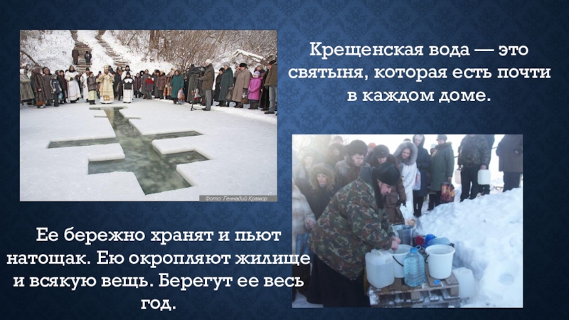 Ее бережно хранят и пьют натощак. Ею окропляют жилище и всякую вещь. Берегут ее весь год.