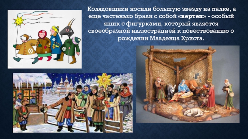 Начинались Святки с хождения славельщиков. В ночь на Рождество дети или подростки отправлялись со звездой по домам славить Христа, т.е. петь под окнами рождественские молитвы.