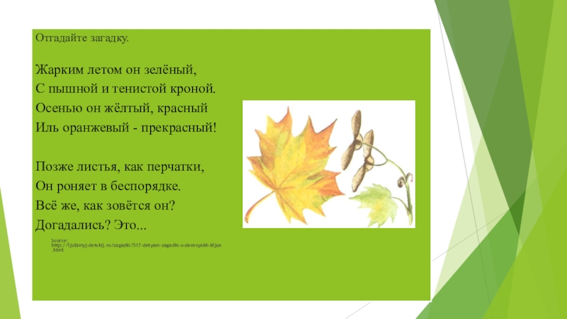 Source: http://ljubimyj-detskij.ru/zagadki/517-detyam-zagadki-o-derevyakh-kljon.html