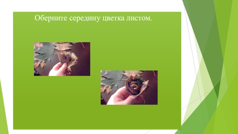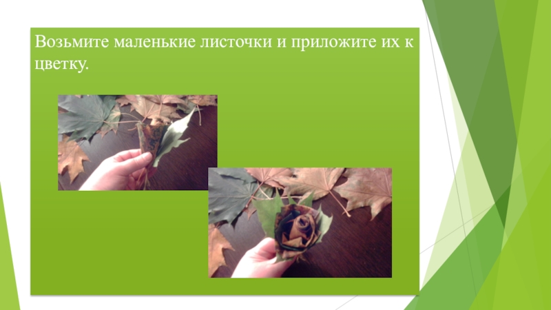 Слайд 18Возьмите маленькие листочки и приложите их к цветку.