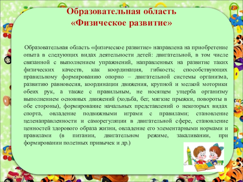 на приобретение опыта в следующих видах деятельности детей: двигательной, в том числе связанной с выполнением упражнений, направленных на развитие таких физических качеств, как координация, гибкость; способствующих правильному формированию опорно – двигательной системы организма, развитию равновесия, координации движения, крупной и мелкой моторики обеих рук, а также с правильным, не носящем ущерба организму выполнением основных движений (ходьба, бег, мягкие прыжки, повороты в обе стороны), формирование начальных представлений о некоторых видах спорта, овладение подвижными играми с правилами; становление целенаправленности и саморегуляции в двигательной сфере, становление ценностей здорового образа жизни, овладение его элементарными нормами и правилами (в питании, двигательном режиме, закаливании, при формировании полезных привычек и др.)