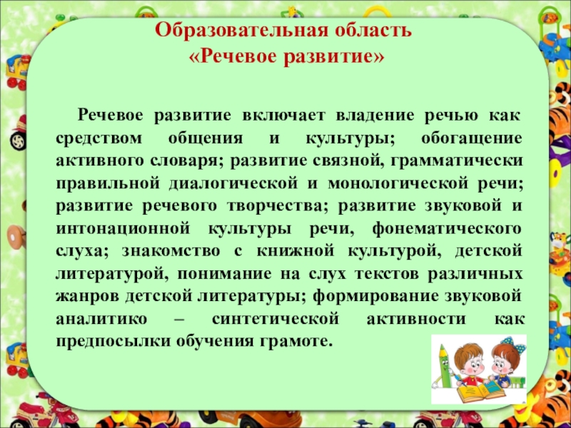 как средством общения и культуры; обогащение активного словаря; развитие связной, грамматически правильной диалогической и монологической речи; развитие речевого творчества; развитие звуковой и интонационной культуры речи, фонематического слуха; знакомство с книжной культурой, детской литературой, понимание на слух текстов различных жанров детской литературы; формирование звуковой аналитико – синтетической активности как предпосылки обучения грамоте.