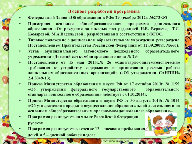 Постановление от 15 мая 2013г.№ 26 «Санитарно-эпидемиологические требования к устройству содержания и организации режима работы дошкольных образовательных организаций» («Об утверждении САНПИН» 2.4.3049-13).