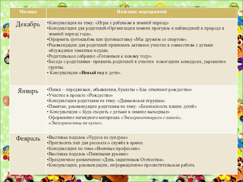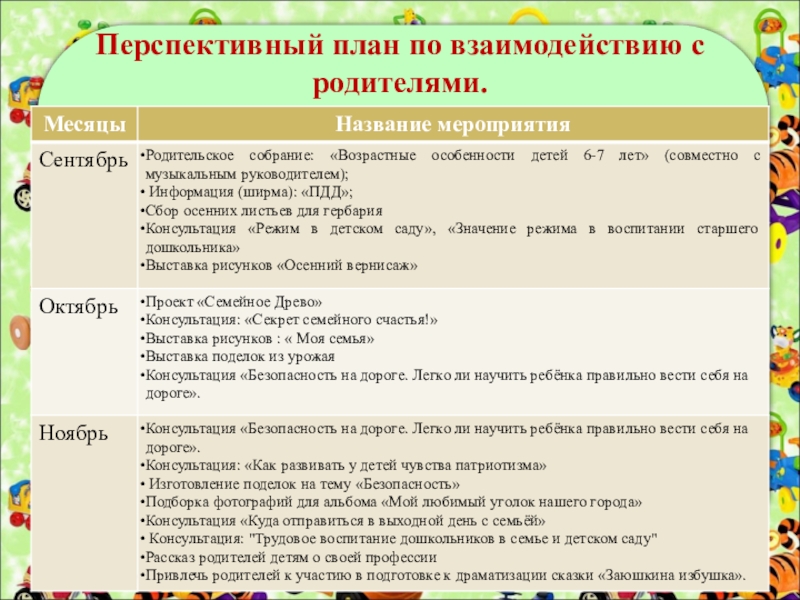 Слайд 21Перспективный план по взаимодействию с родителями.