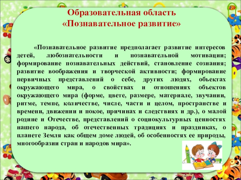 интересов детей, любознательности и познавательной мотивации; формирование познавательных действий, становление сознания; развитие воображения и творческой активности; формирование первичных представлений о себе, других людях, объектах окружающего мира, о свойствах и отношениях объектов окружающего мира (форме, цвете, размере, материале, звучании, ритме, темпе, количестве, числе, части и целом, пространстве и времени, движении и покое, причинах и следствиях и др.), о малой родине и Отечестве, представлений о социокультурных ценностях нашего народа, об отечественных традициях и праздниках, о планете Земля как общем доме людей, об особенностях ее природы, многообразии стран и народов мира».