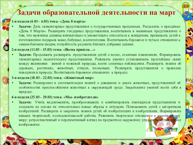 Задачи: Дать элементарные представления о государственных праздниках. Рассказать о празднике «День 8 Марта». Расширять гендерные представления, воспитывать в мальчиках представление о том, что мужчины должны внимательно и уважительно относиться к женщинам; привлекать детей к изготовлению подарков маме, бабушке, воспитателям. Воспитывать бережное и чуткое отношение к самым близким людям, потребность радовать близких добрыми делами.