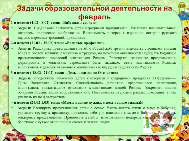 Задачи: Расширить представление детей о Российской армии; знакомить с разными видами войск и боевой техники; рассказать о трудной, но почетной обязанности защищать Родину; о преемственности поколений защитников Родины. Расширять гендерные представления, формировать в мальчиках стремление быть сильным, стать защитниками Родины; воспитывать у девочек уважение к мальчикам как будущим защитникам Родины.