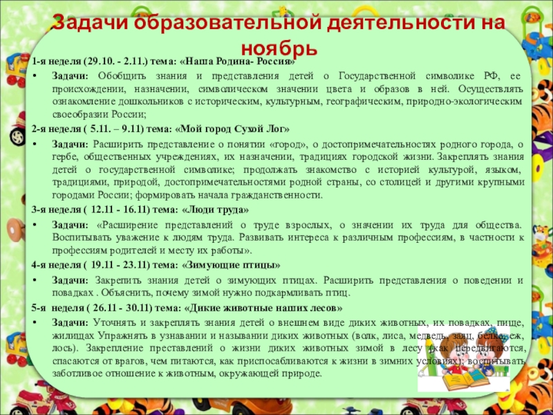 Слайд 14Задачи образовательной деятельности на ноябрь