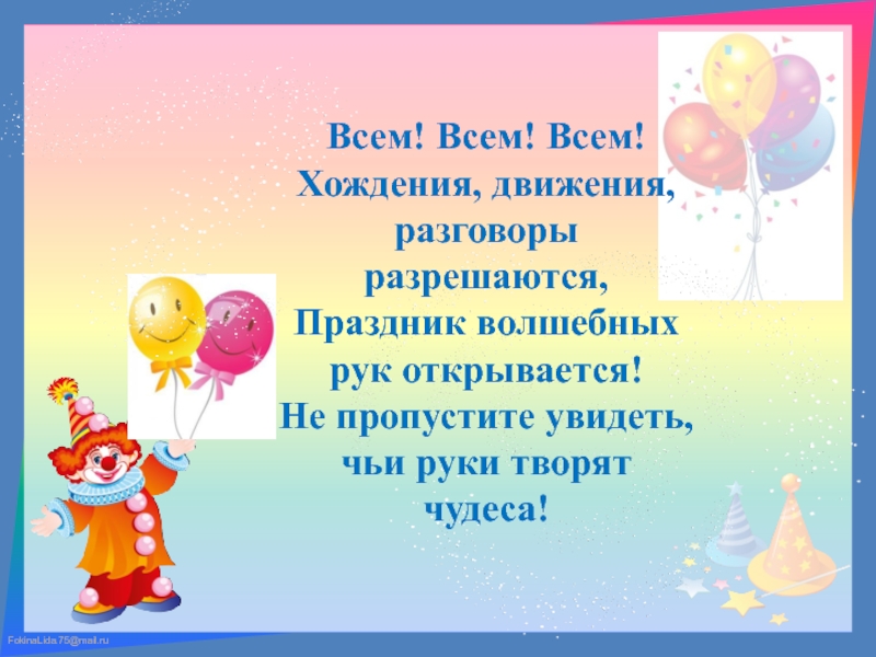 Всем! Всем! Всем!Хождения, движения, разговоры разрешаются,Праздник волшебных рук открывается! Не пропустите увидеть, чьи руки творят чудеса!