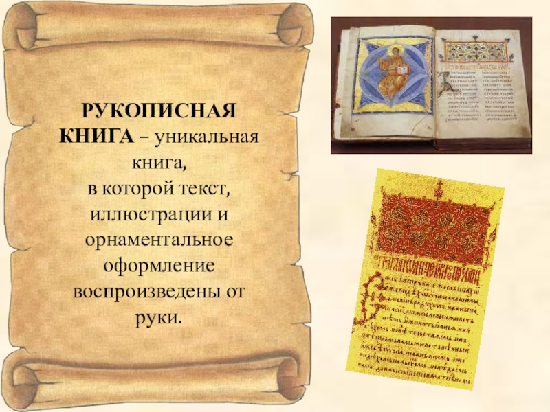 Рукописная книга — это книга, текст и иллюстрации к которой воспроизведены от руки, в отличие от печатной книги, воспроизведение которой осуществляется полиграфическим способом. Рукописная книга состоит из собственно книги — носителя текста и защитно-предохраняющих элементов (футляр, переплёт).