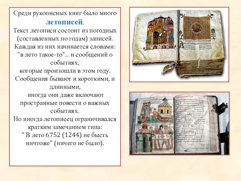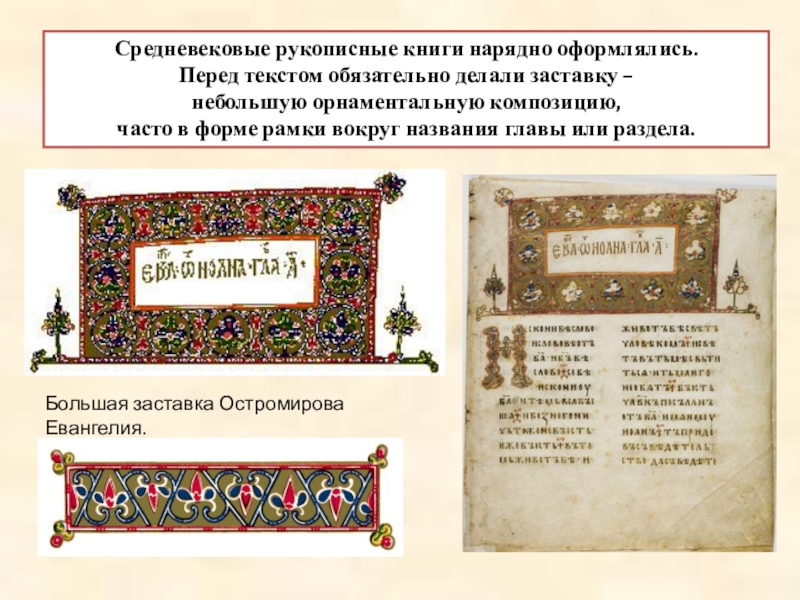 Выполненные от руки иллюстрации (рисунки) называются миниатюрами — от латинского слова «миния», которым древние римляне обозначали красную краску. Делали миниатюры особые мастера — художники-миниатюристы.