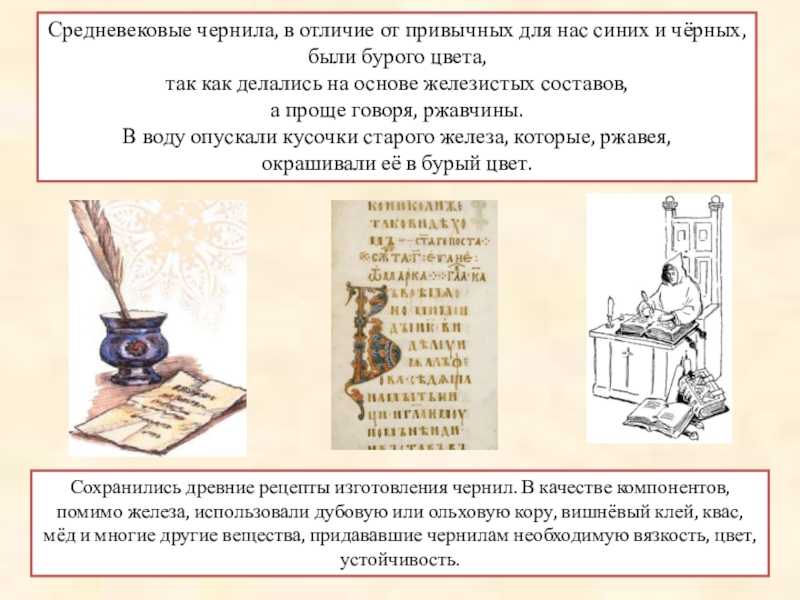 Сохранились древние рецепты изготовления чернил. В качестве компонентов, помимо железа, использовали дубовую или ольховую кору, вишнёвый клей, квас, мёд и многие другие вещества, придававшие чернилам необходимую вязкость, цвет, устойчивость.