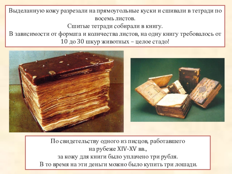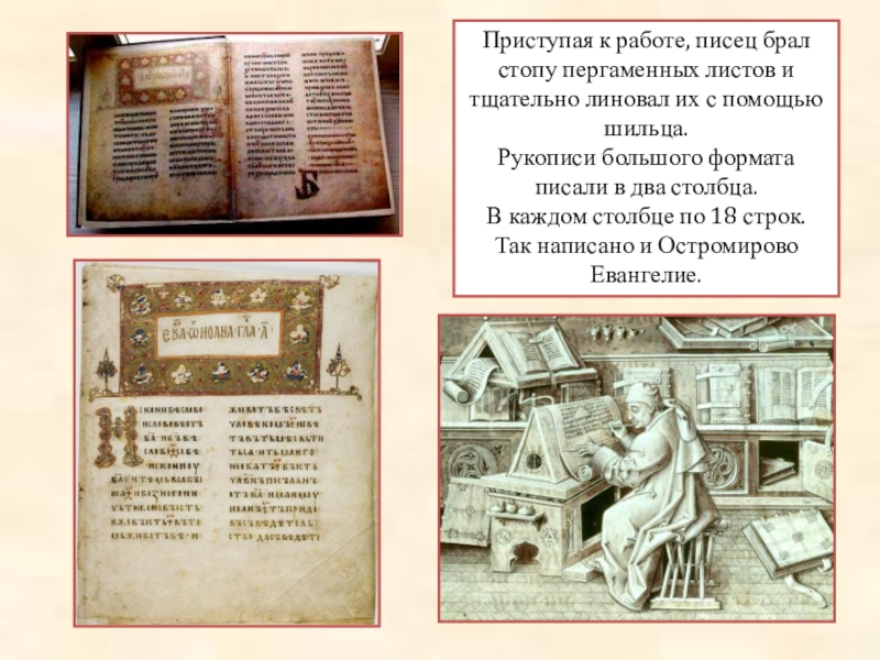 Создание рукописи - это тяжёлый и изнурительный труд. Рабочий день длился летом от восхода и до заката солнца, зимой же захватывали и тёмную половину дня, когда писали при свечах или лучинах.