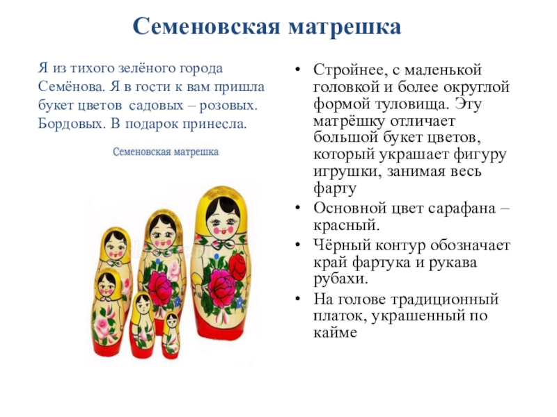Я из тихого зелёного города Семёнова. Я в гости к вам пришла букет цветов садовых – розовых. Бордовых. В подарок принесла.