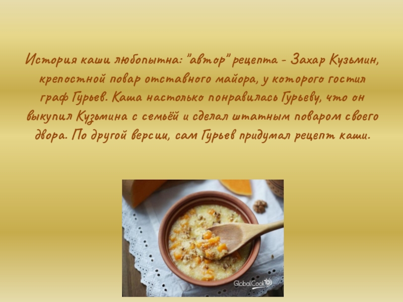 Слайд 18История каши любопытна: "автор" рецепта - Захар Кузьмин, крепостной повар отставного
