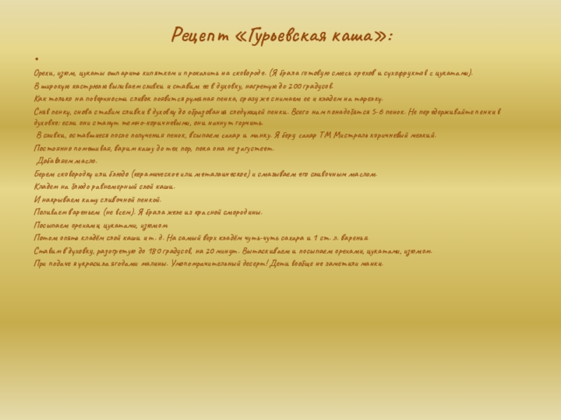 Слайд 17"Гурьевская каша" —приготовляемая из манной крупы на молоке с добавлением орехов,