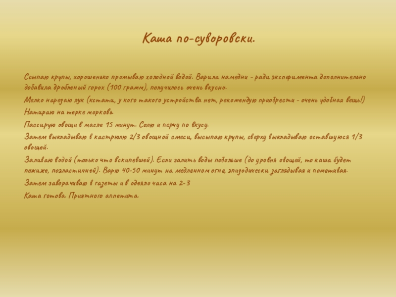 Слайд 16Знаменитый рецепт одной из каши родился во время тяжёлого похода через