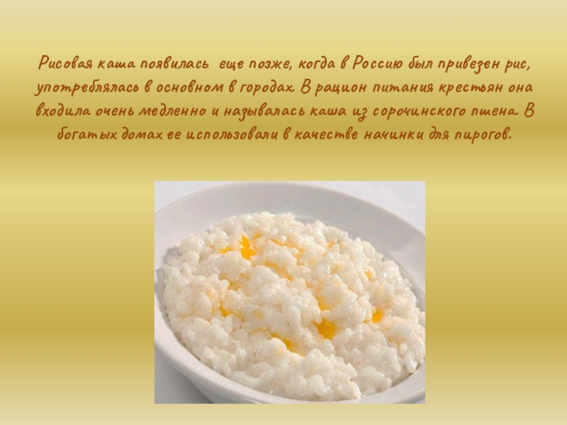Слайд 14Рисовая каша появилась еще позже, когда в Россию был привезен рис,