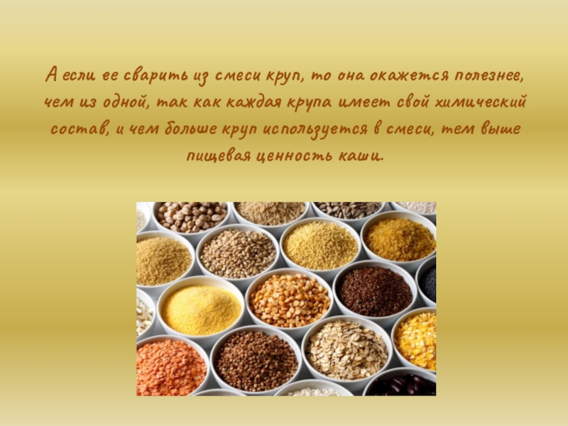 Слайд 21А если ее сварить из смеси круп, то она окажется полезнее,