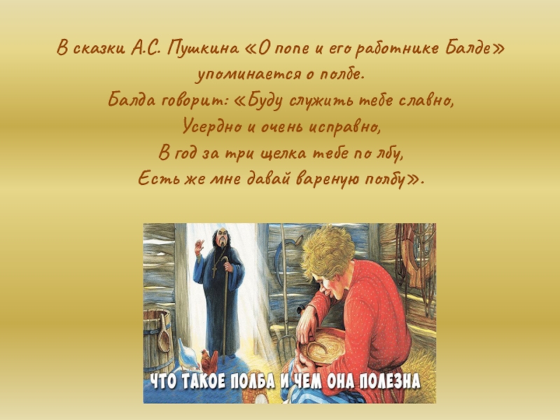 Слайд 11В сказки А.С. Пушкина «О попе и его работнике Балде» упоминается