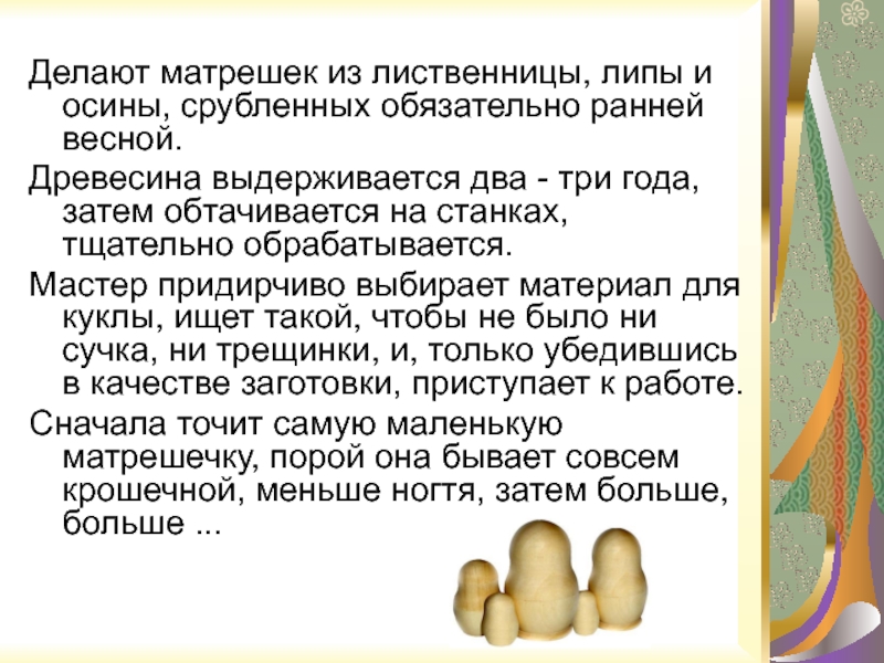 Слайд 11Делают матрешек из лиственницы, липы и осины, срубленных обязательно ранней весной.