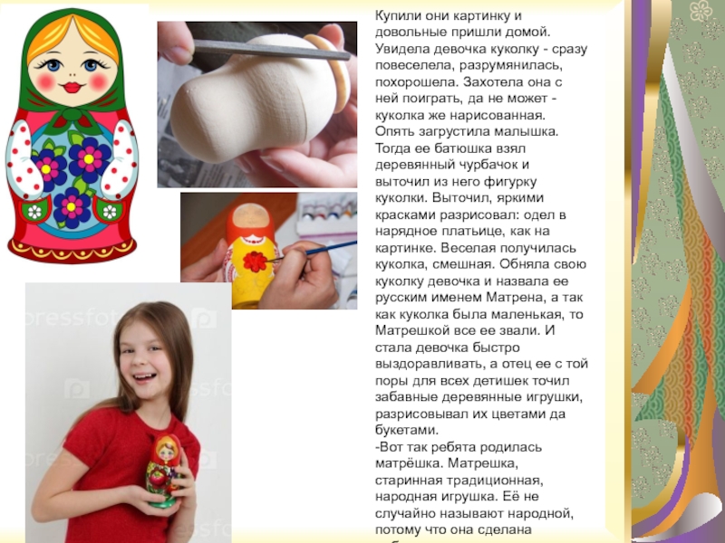 сразу повеселела, разрумянилась, похорошела. Захотела она с ней поиграть, да не может - куколка же нарисованная. Опять загрустила малышка. Тогда ее батюшка взял деревянный чурбачок и выточил из него фигурку куколки. Выточил, яркими красками разрисовал: одел в нарядное платьице, как на картинке. Веселая получилась куколка, смешная. Обняла свою куколку девочка и назвала ее русским именем Матрена, а так как куколка была маленькая, то Матрешкой все ее звали. И стала девочка быстро выздоравливать, а отец ее с той поры для всех детишек точил забавные деревянные игрушки, разрисовывал их цветами да букетами.