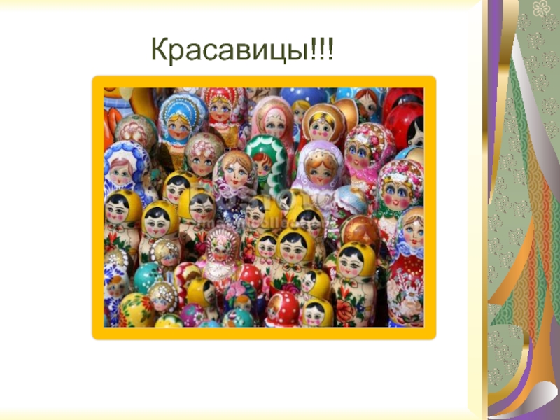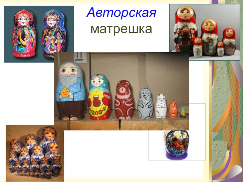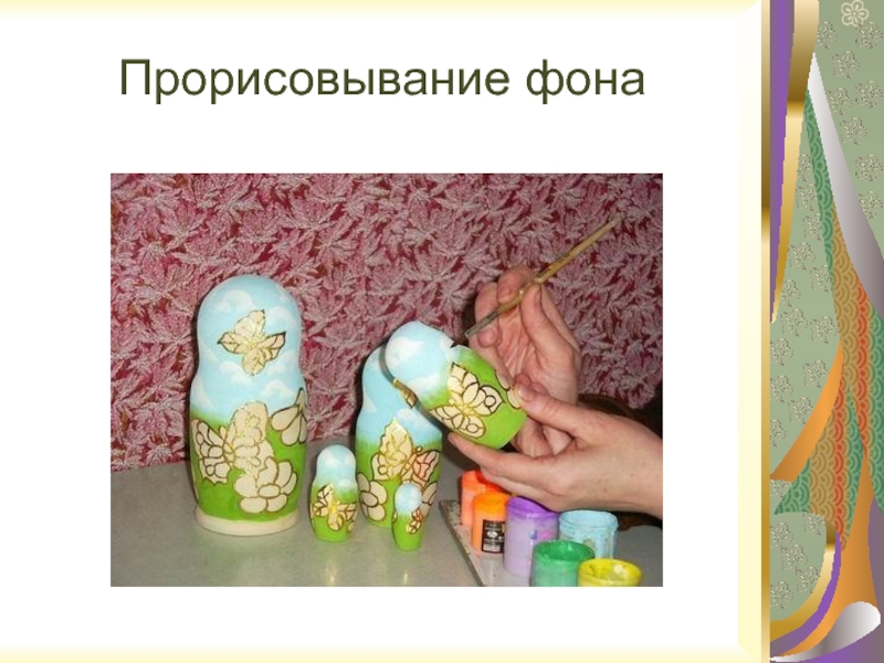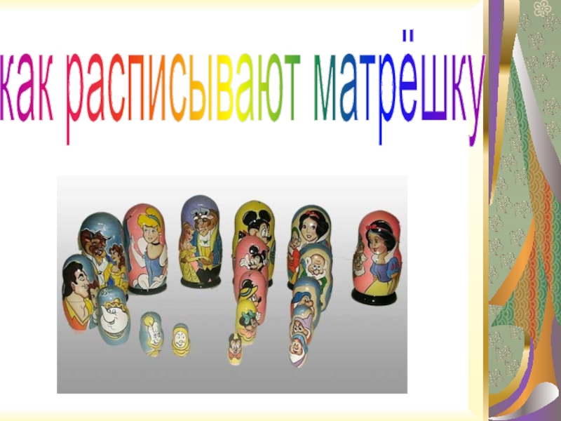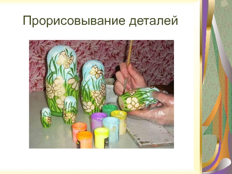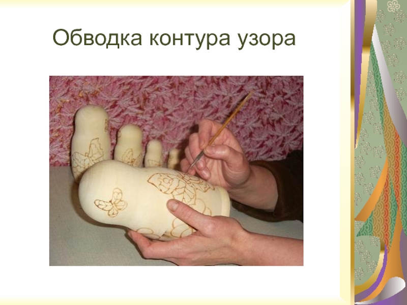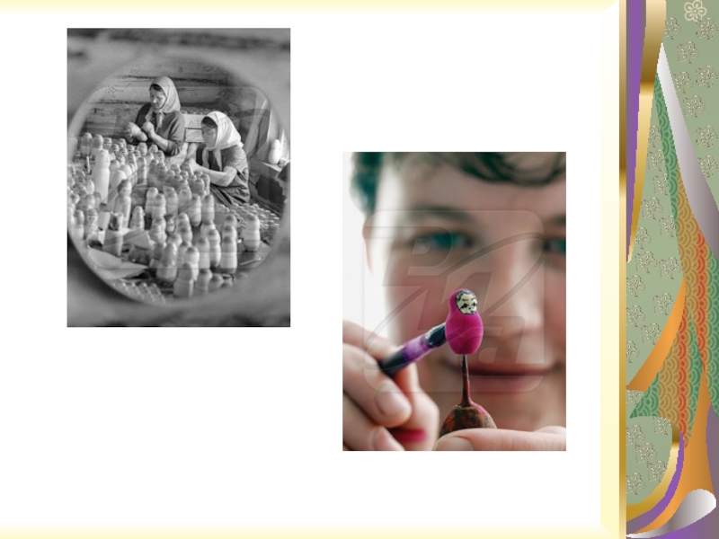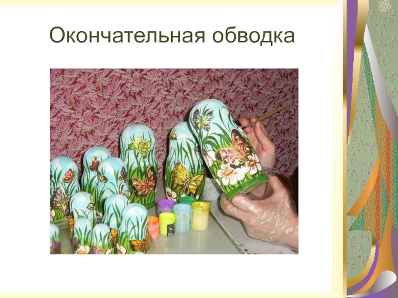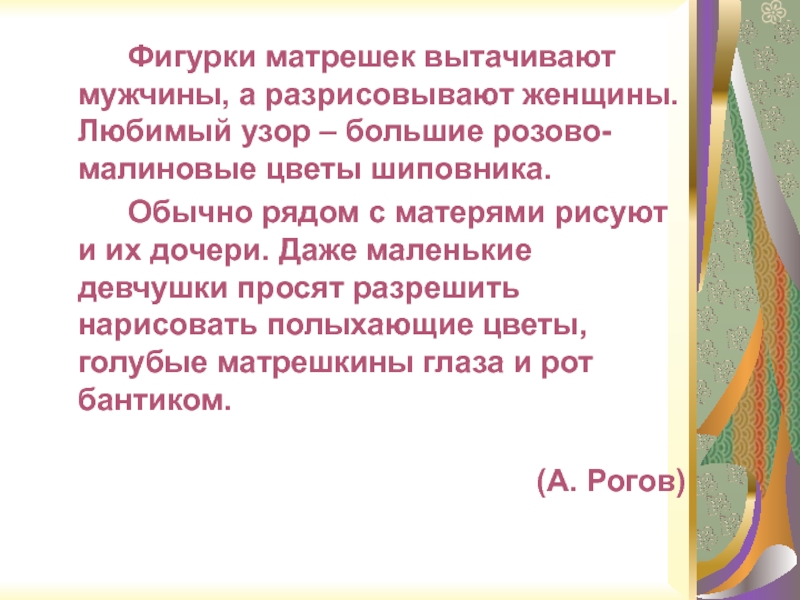 Слайд 10 Фигурки матрешек вытачивают мужчины, а разрисовывают женщины. Любимый узор – большие